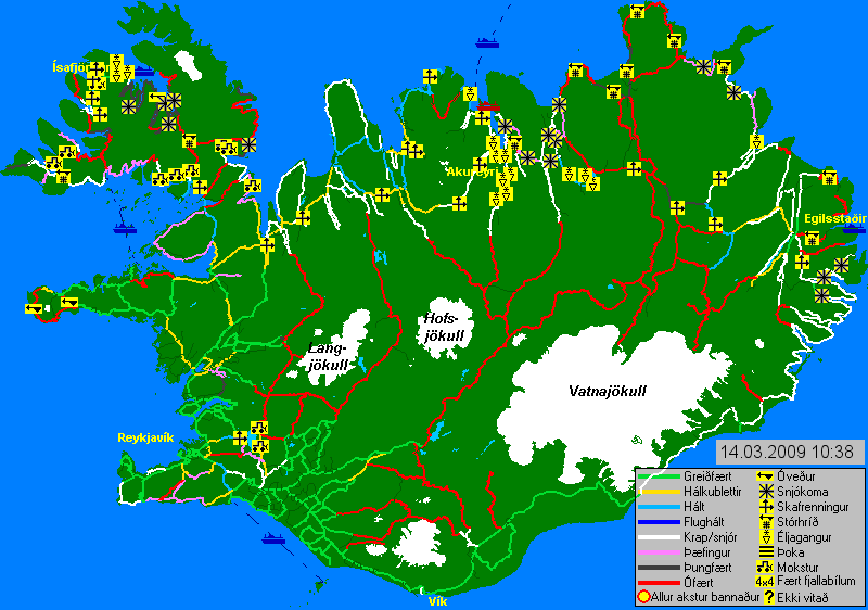 für das Wochenende war hier oben in der Gegend bei Ásbyrgi bereits im Vorfeld sehr schlechtes Wetter mit Schnee(-regen) und Sturmböen angekündigt, weswegen wir auch schon gestern nach Húsavík gefahren sind, um die Wochenendeinkäufe zu erledigen. Ich habe gerade mal die Nase aus der Haustür gesteckt und beschlossen, dass dieser Tag prädestiniert dafür ist, unter der Bettdecke verbracht zu werden. Anbei mal die aktuelle Zustandskarte der Vegagerðin zum Spass. Falls es mit dem Einfügen nicht geklappt hat, findet ihr die Karte im Anhang.