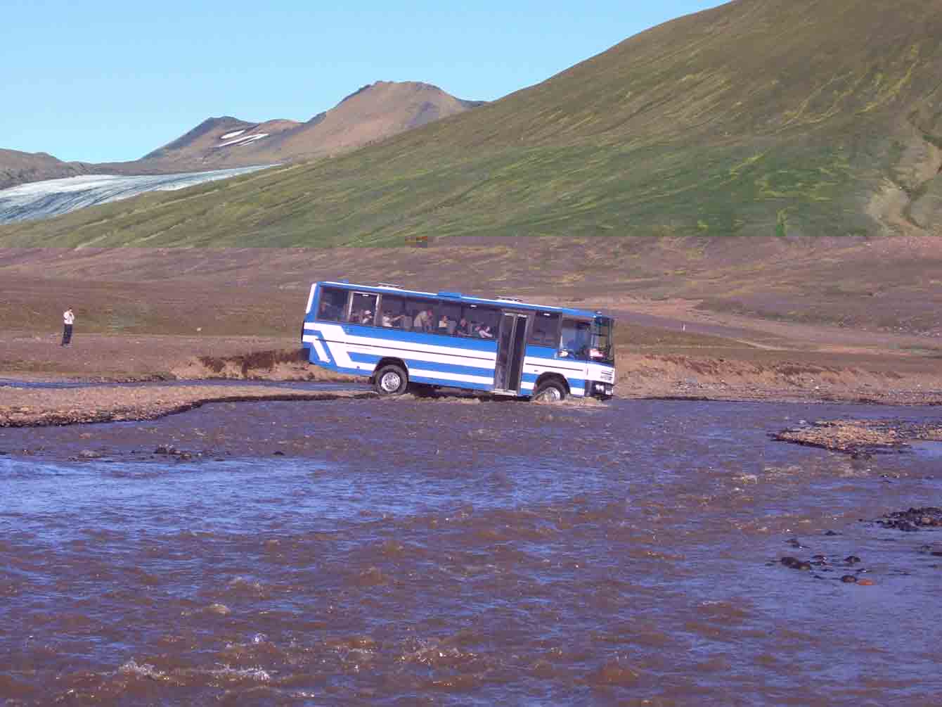 Und hier noch ein Foto von der ersten Furt von Norden aus kommend. Die Stelle wo der Bus furtet ist die regulaere Furt gewesen - fuer uns viel zu tief.