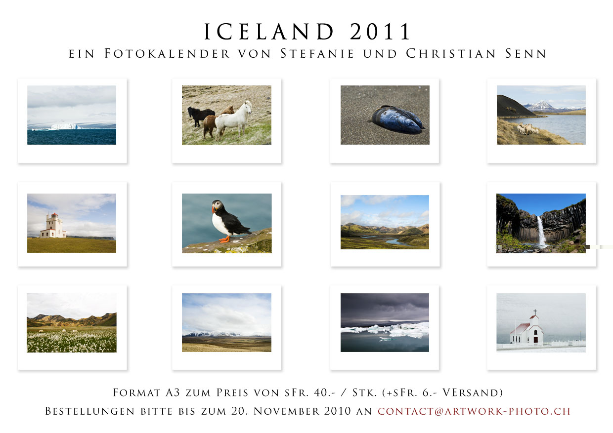 Ab sofort kann unser Islandkalender 2011 bestellt werden. Ausgeliefert wird er ab Anfang Dezember so dass er noch pünktlich vor Weihnachten eintrifft. Der Kalender ist nur in der Schweiz lieferbar.