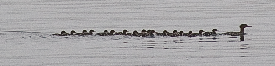 Ist es auch nicht ungewöhnlich, dass soviele kleine dabei sind? Ist auf jeden Fall eine Riesenentenfamilie. Oder macht gerade die Entenschule einen Ausflug mit der Lehrerin? Vielleicht haben sie die zwei Menschen in den bunten Zelten begutachtet.