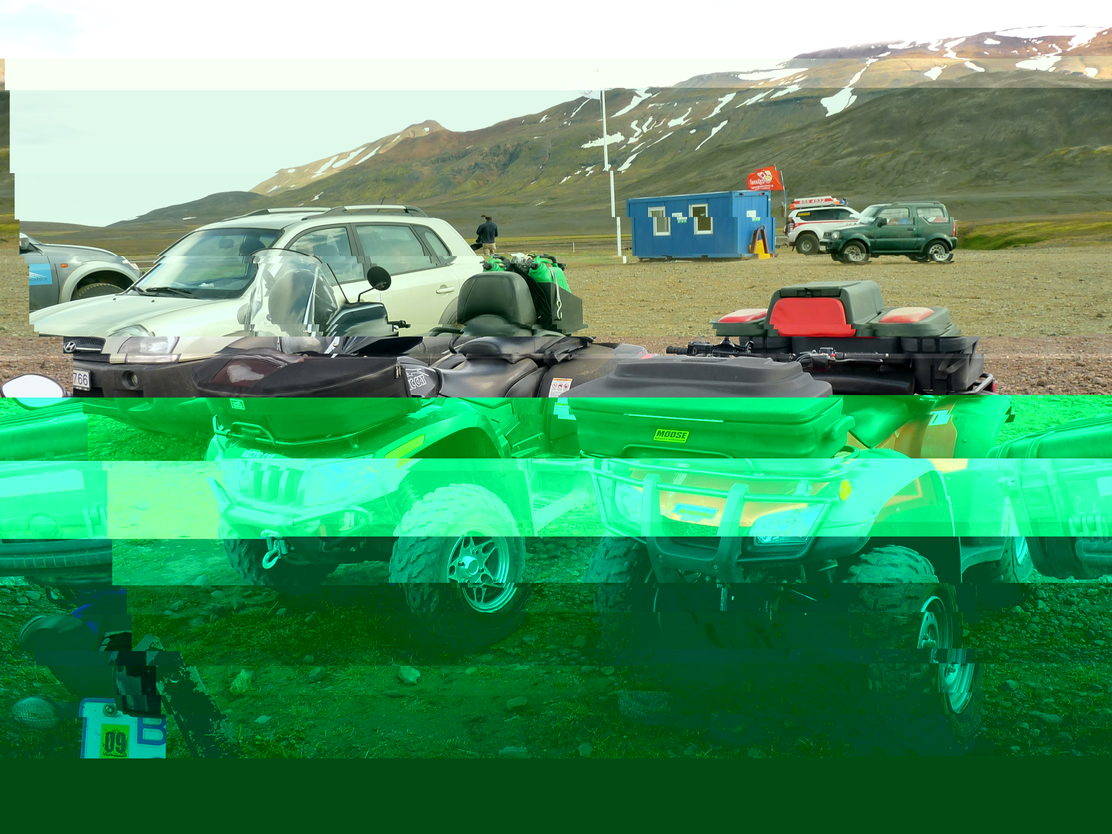 Ich glaube Quadfahren im Hochland ist bei den Isländern sehr angesagt. Mir sind sie des öfteren dort begegnet. Aber Quad ist nicht gleich Quad . Das waren meißt große Teile, z.B.mit Abschlepphaken etc.. Die haben auf jeden Fall Respekt vor dem Gelände und dem Wetter. Als Die mal in Nydalur auftauchten und sich in der Hütte auspellten, sah man die exzellente Wetterkleidung inklusive diverse Protektoren. Fast wie Ritterrüstungen.