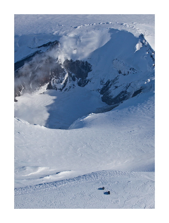 * Eyjafjallajökull: Krater schneefrei, in der Mitte ein Riss, aus dem immer noch starke Rauch-/Dampfwolken hochsteigen. Am Kraterrand standen 2 Superjeeps, außerdem waren aus der Luft mehrere Skitourengänger erkennbar