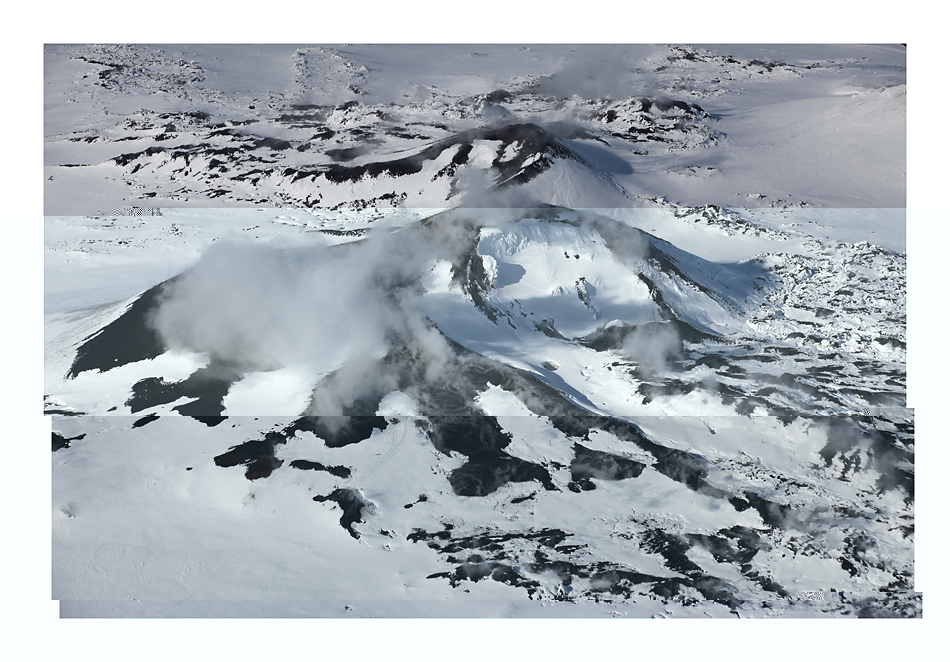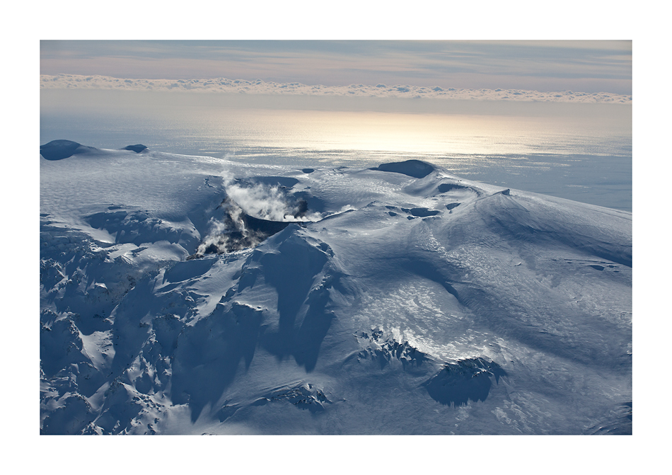 Morgens kurz nach Sonnenaufgang hebt unsere Maschine in Keflavik ab. Einige Minuten später merkt man als Passagier, dass der Pilot relativ abrupt seine Richtung ändert. Ein Blick durchs Fenster auf der linken Seite läßt erahnen, dass die 2 Tage zuvor gestoppten vulkanischen Aktivitäten weiter gehen:
