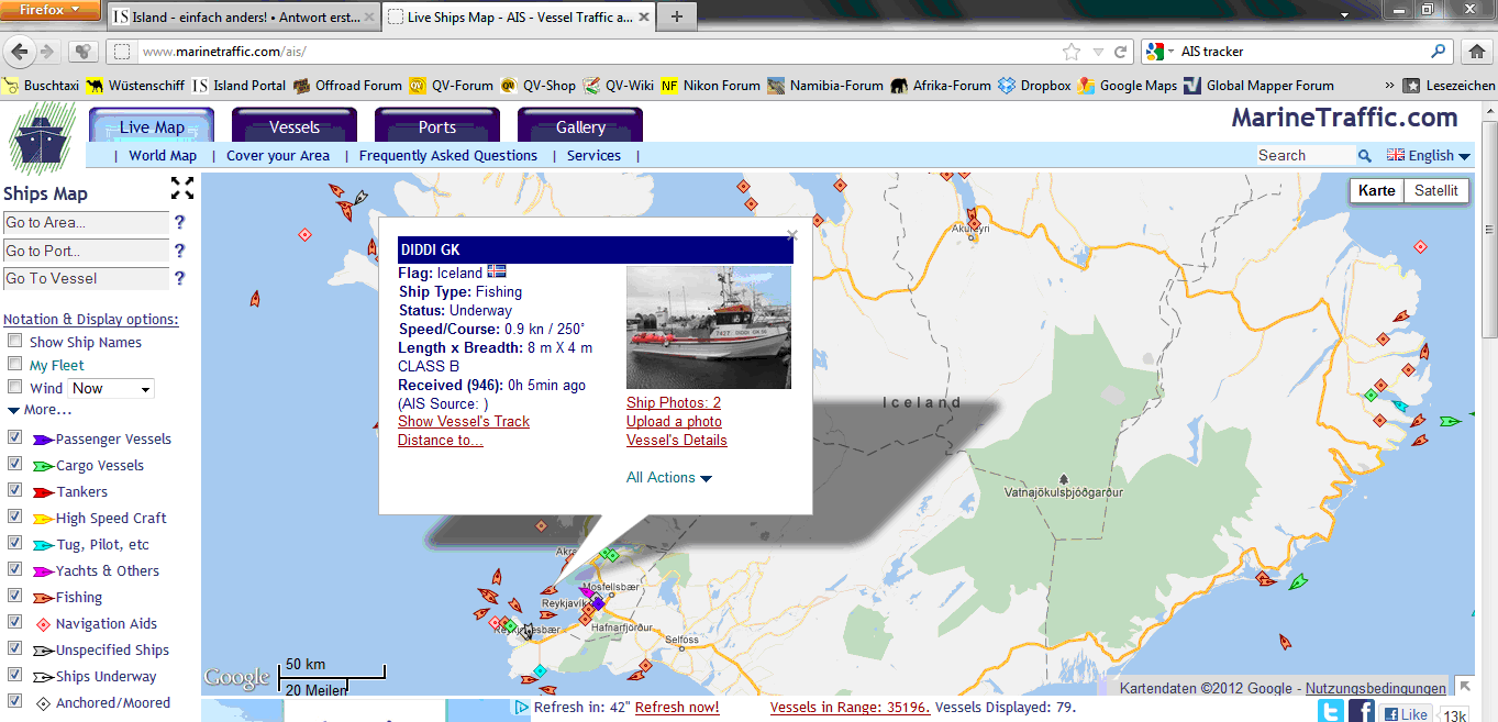 Ausrüstungspflichtige Schiffe (ab einer gewissen Grössenordnung) müssen schon seit längerem über AIS die Position und noch einige Zusatzinfos übermitteln.Argish hat geschrieben:Hatt die Norröna schon lange ein real-time tracking?