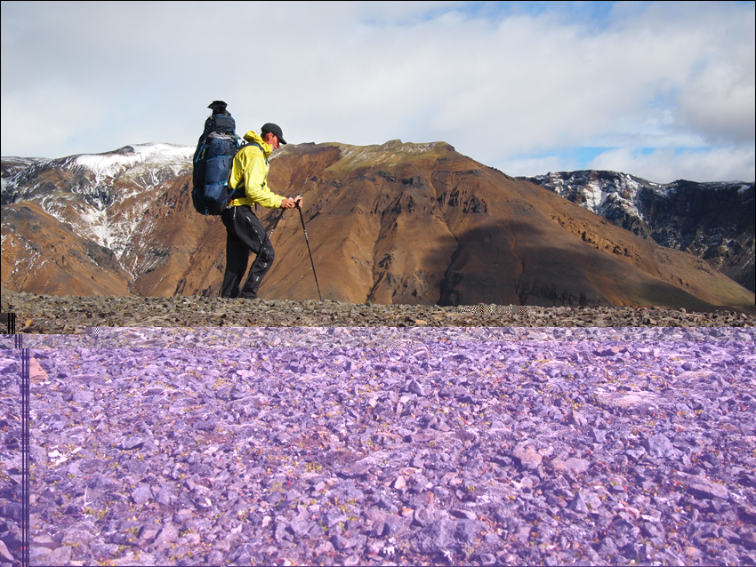 Ich packe das Zelt ein. Auf geht es zur einer (doppelte) Tagesetappe zum Hitulaug Syðri v. Marteinsflæða. Die schlechte Laune hält an bis zur erste Pause unten am Gjóstuklif. Die Fleece-mütze zu heiss; ohne Mütze zu kalt. Der Rucksack quält mich, versuche verschiedene möglichkeiten die Lasst auf Hüft bzw. Schultern zu verlagern, doch es nutzt alles nichts. Grrrr, Donnerwetter !!! Ich suche abwechslung im dem, auf den ersten Blick, öde Gelände. Sehe sowohl graue als braunrote Sandflächen, wo über graue, dunkelblaue und weisse Wolken schweben. Und immer mehr und mehr Lücken dazwischen.