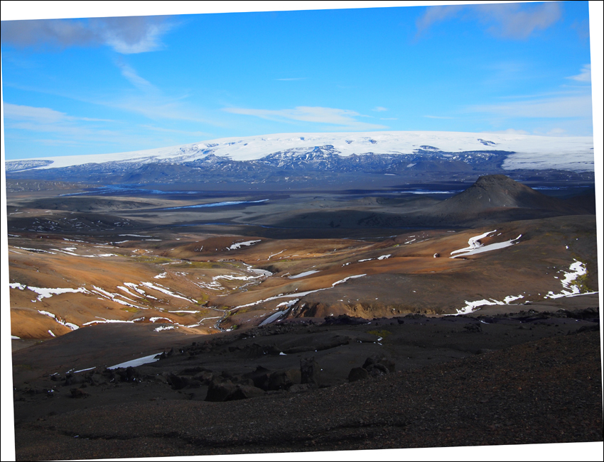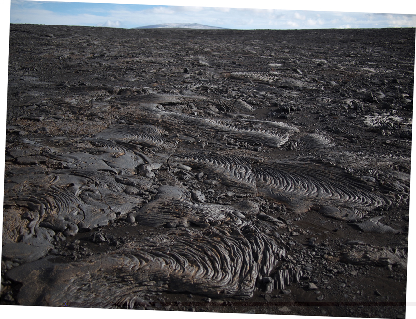 Heute erblicke ich zusätzlich die Kverkfjöll im Süden und Kerlingardyngja im Norden. Nach der erste Pause wieder mal Plattenlava, bis hin zu Fjallsendi.