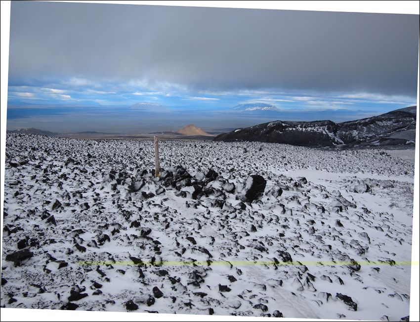Ich sehe kurz unter mich eine Schneedüne und hüpfe wie ein Kangaroo hinein. Der Wind rasst nun über meinen Kopf. Ich muss hier hinunter, und zwar schnellstens (aber nicht zu schnell !). Auch nun kommen die Steigeisen zu nutze. "Mein" schneefeld läuft ununterbrochen bis zum Boden, verliere aber so wieder die Markierungen. Unten am Boden angekommen, erstmal eine Pause. Die Steigeisen können wieder eingepackt werden. Dannach suche ich wieder die Streckenmarkierungen, doch vergeblich. Von einer kleine Anhöhe überblicke ich das raue Lavafeld vor mir, wass nun ? Am rande des Lavafeldes entlang, oder....versuchen dieses Feld zu queren; es ist Blocklava.
