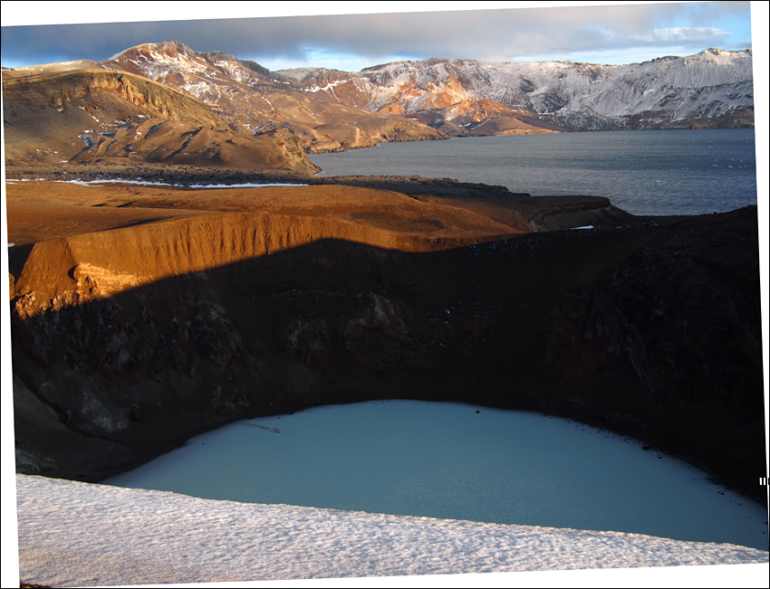 Eins habe ich aber schon sehr schnell auf meine Íslandreisen gelernt. Gutes Wetter sollte mann nutzen, wer weiss wie das Wetter morgen , oder sogar schon nach 5 minuten, sein wird ? Also auf zur Víti. Ich bin überrascht hier noch so spät 4 Leute anzutreffen, also heute nacht werde ich warscheinlich nicht alleine in der Drekaskáli sein. Ich umrunde die Víti als ich in dessen Kratersee eine braune Spur im türkies-grünen Wasser sehe. Da nimmt doch noch jemand ein Bad ! Brrrrr. Und dieser "Eiergeruch" möchte ich heute abend aber nicht neben mir schlafen haben (nicht das ich momental besser rieche...). Knipse links und rechts ein paar Bilder. Muss mich aber immer wieder dazu zwingen weiter zu laufen, denn das Tageslicht hält im September nicht ewig !