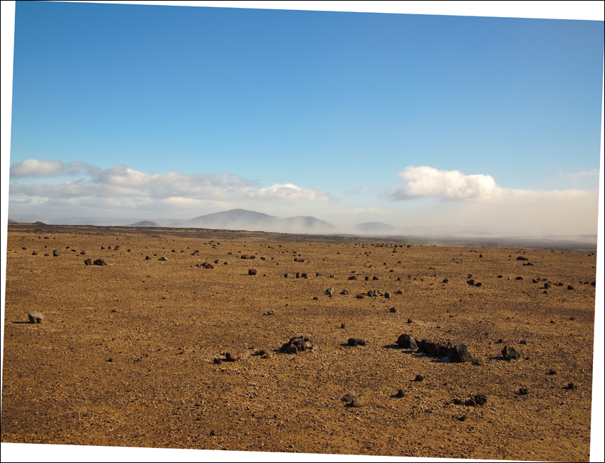 Sie meint: die Route gab es mal durch dieses Lavafeld, ist aber dan später verlegt worden. Auch frage ich ihr nach diesen art von Nebel der heute am fusse des Upptyppingars schwebt, den hier werde ich nach verlassen der Drekaskáli die erste Nacht zelten. Es ist einen mix aus Staub, Sand und Schnee dessen da nun herum fliegt. Schaut also nicht unbedingt attraktiv aus...