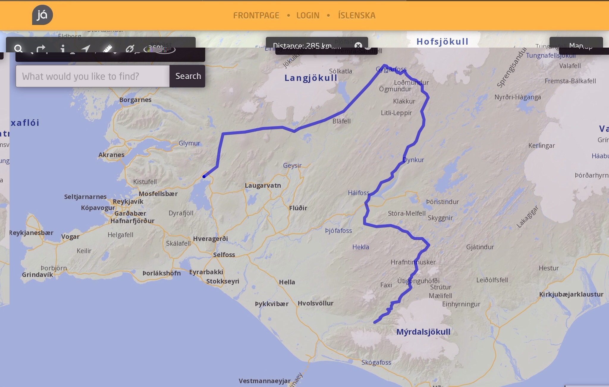 Den Laugarvegur komplett, dann zügig bis zur F26 Richtung Pjösardalur, dann nach Norden entlang der Pjörsar zum Kerlingarfjöll und von dort im Bogen über den Kjölurvegur zurück nach Süden.