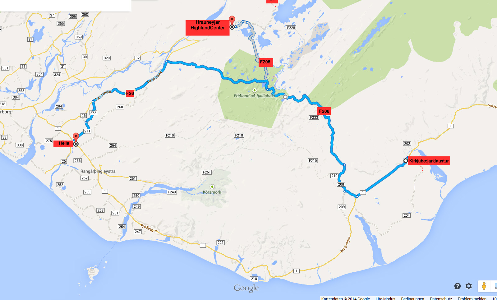 Jetzt hab ich die Hotelliste bekommen und die Unterkunft ist statt in Hella im Hrauneyjar Highland Center. Das hieße wir würden statt über die F208 und F225 (Landmannaleið) zu fahren, auf die 26 nach Norden abbiegen.
