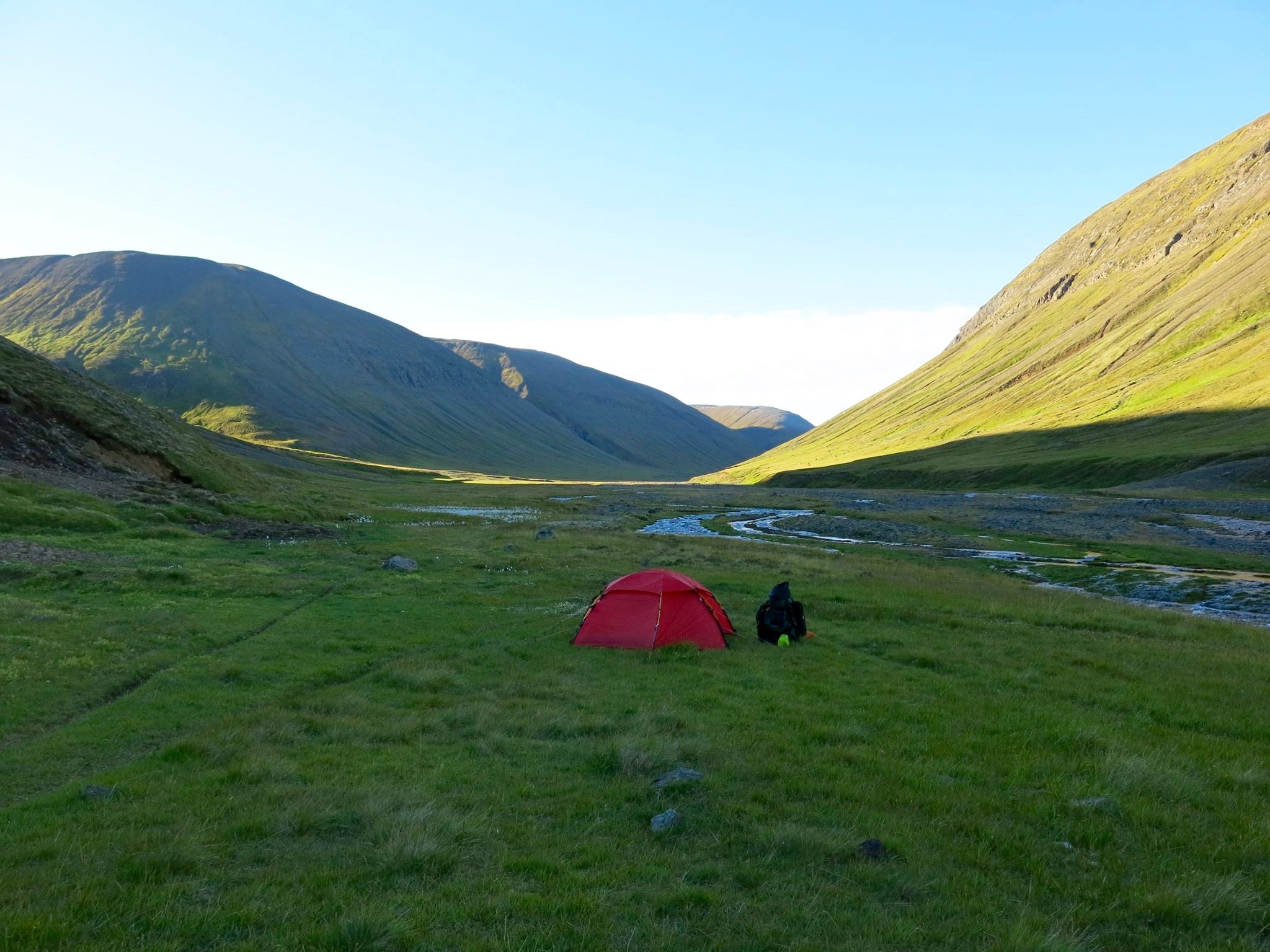Ich befinde mich am Eingang zum Garosardalur Tal. Der Pfad der vor mir liegt ist holperig und teilt sich immer wieder. Aber es ist alles in allem recht einfach auf dem richtigen Weg zu bleiben. Das Tal und der Weg der vor mir liegt sind wunderschön. Ich Zelte auf einer Wiese nach knapp 20km auf meiner eigentlichen Strecke. Ich bin total müde da ich im Hostel nicht gut geschlafen habe und gehe früh schlafen.