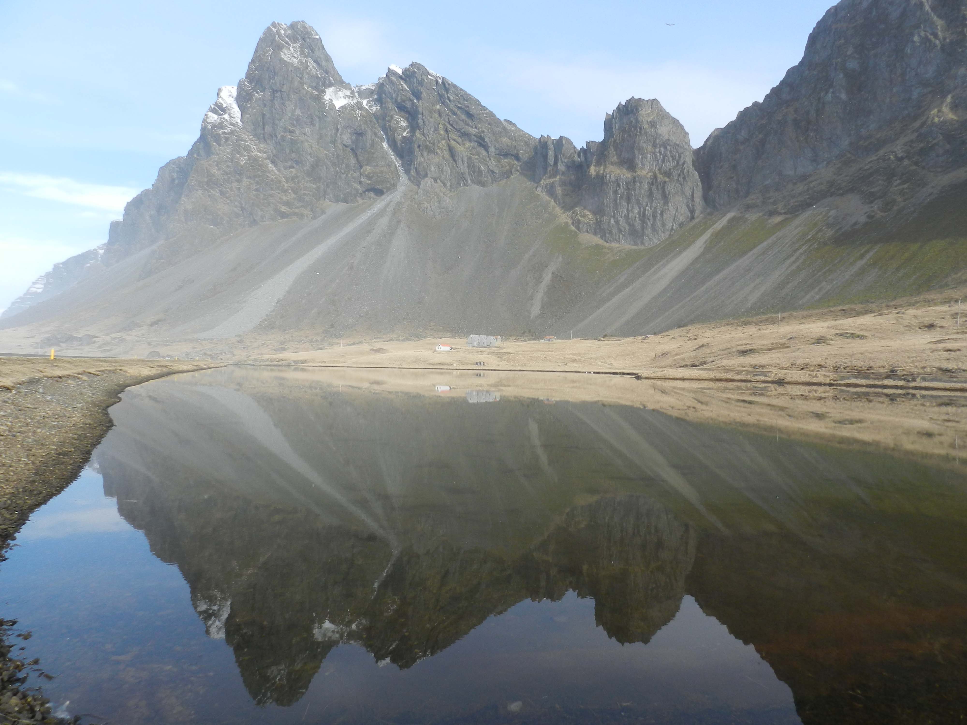 Im Süden waren es dagegen an diesem Tag sogar 25 m/s - da gab es dann schon den zusätzlichen Hinweis „bleiben Sie besser zu Hause, wenn Sie nicht unbedingt fahren müssen“.Bis wir in den Süden kamen war das Horrorwetter glücklicherweise vorbei, und - wie so oft nach schweren Unwettern – waren die Wetterverhältnisse optimal: Kein Wölkchen am Himmel, völlig staubfreie Luft, d.h. uneingeschränkte Fernsicht, absolute Windstille ... insgesamt allerbeste Fotobedingungen, so dass wir alle paar Minuten einen Fotostopp einlegten für das immer wieder beliebte „Berg spiegelt sich im Wasser“-Motiv