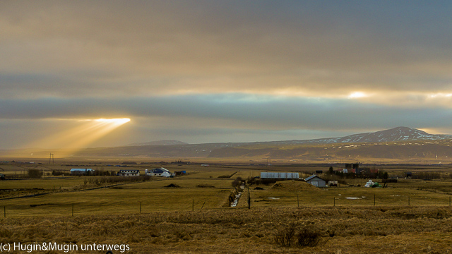 Ein warmes Häuschen erwartete mich, das Bett war bezogen, die Teelichter auf dem Küchentisch waren frisch ausgetauscht. Beim Ausladen meldete sich die Nordlicht-App mit einer Wahrscheinlichkeit von 37% für Selfoss. Allerdings hatte sich der Himmel im Laufe des Nachmittags immer mehr zugezogen, nur vereinzelt ließen die Wolken die Strahlen der Abendsonne durch.
