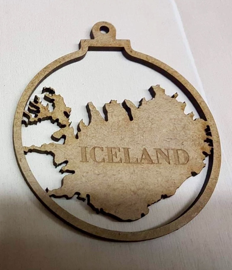 Der Weihnachtsanhänger ist gelasert, in 3 mm Holz, 7,5 cm im Durchmesser. Die Schreibweise des Aufdrucks ist Ísland mit großem l und Akzent, also anders als auf dem Foto!