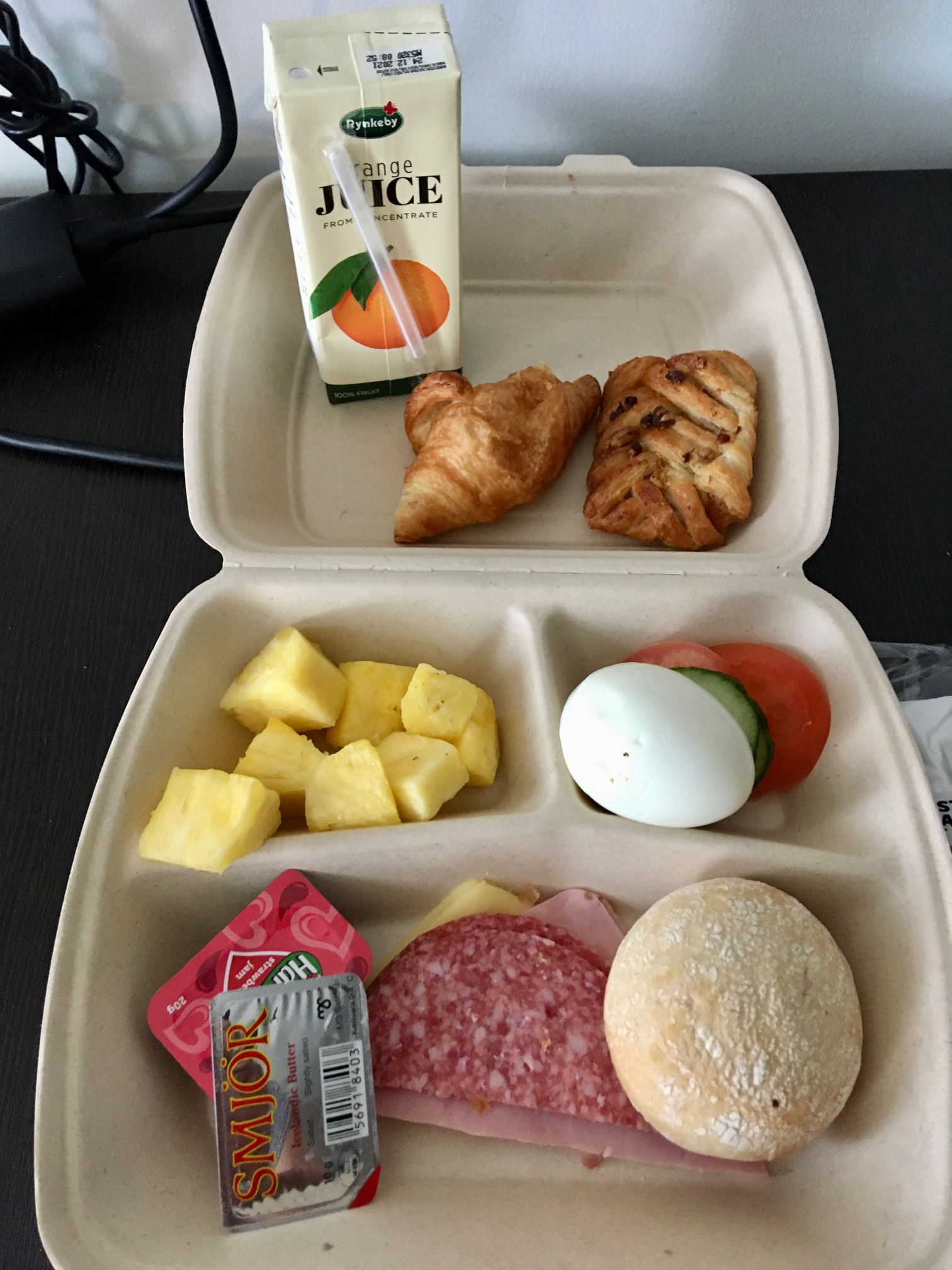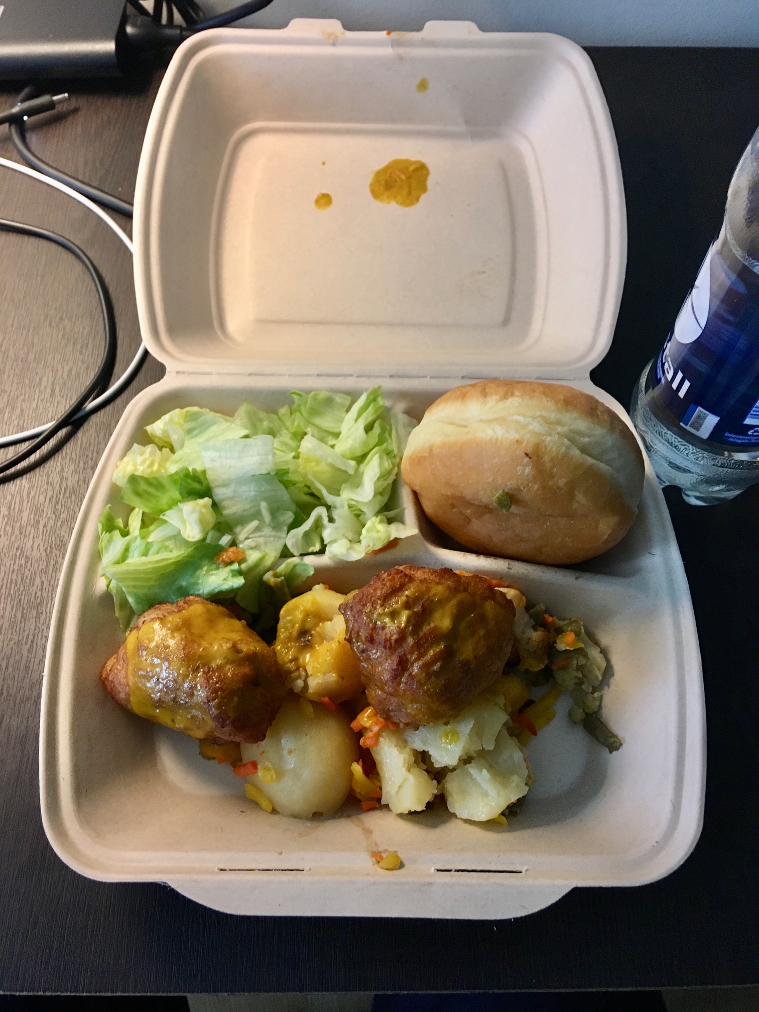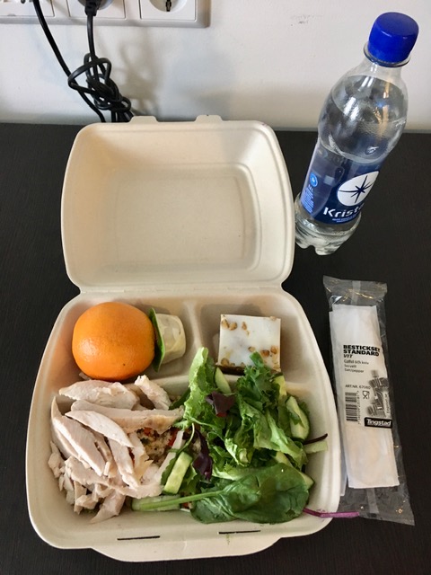 Es gibt 3x am Tag Essen. Dazu wird an die Tür geklopft, das Leergut stellt man dann wieder vor die Tür. Beim Einchecken in die Unterkunft wird man nach Lebensmittelallergien gefragt. Unser Abendessen heute: Couscous, Hähnchen, Salat, Orange, Karottenkuchen, Wasser. Wer clever ist, kauft am Flughafen noch im Duty Free Shop ein ( 8-)) .